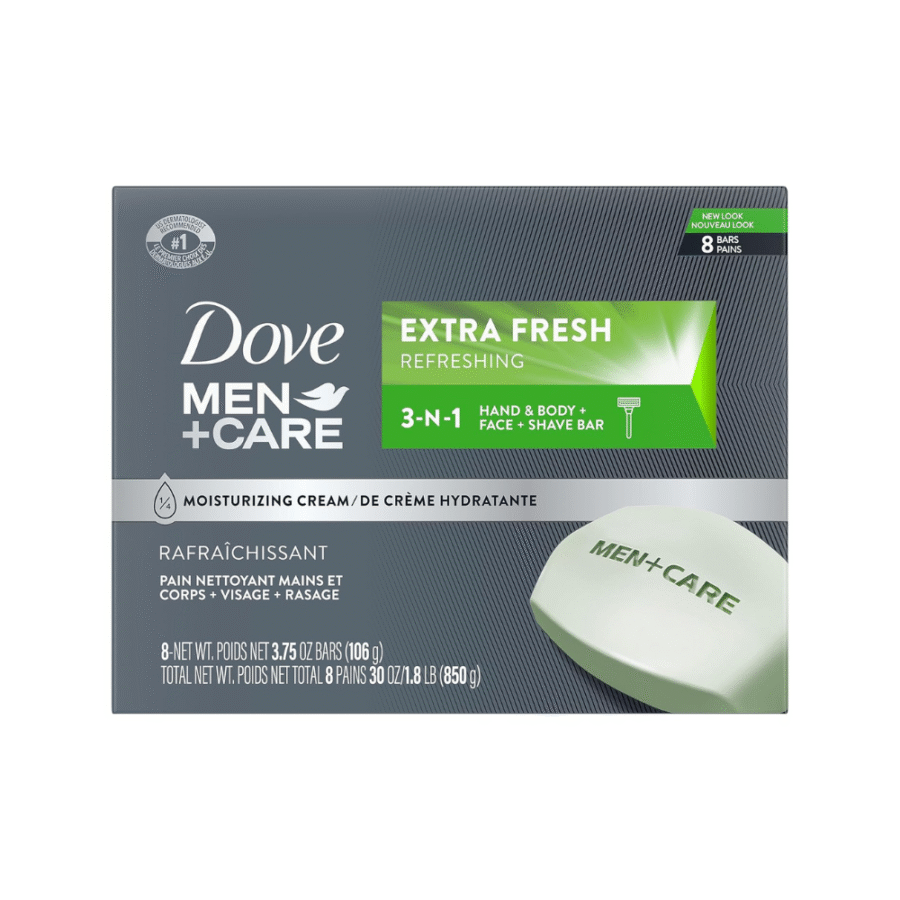 Experience the difference with Dove Men+Care Extra Fresh 3-in-1 Bar Cleanser, designed for men’s unique skin needs. Unlike regular bar soap that can leave skin feeling tight and dry, this dermatologist-recommended formula deeply cleans while infusing skin with moisture. More than just a bar soap, it’s a body cleanser, facial wash, and shaving aid all in one. The crisp scent of Mandarin Citrus, Patchouli, and Rosemary leaves you feeling refreshed and confident. Developed to combat men’s faster moisture loss and thicker skin texture, this bar keeps skin smooth, hydrated, and comfortable.