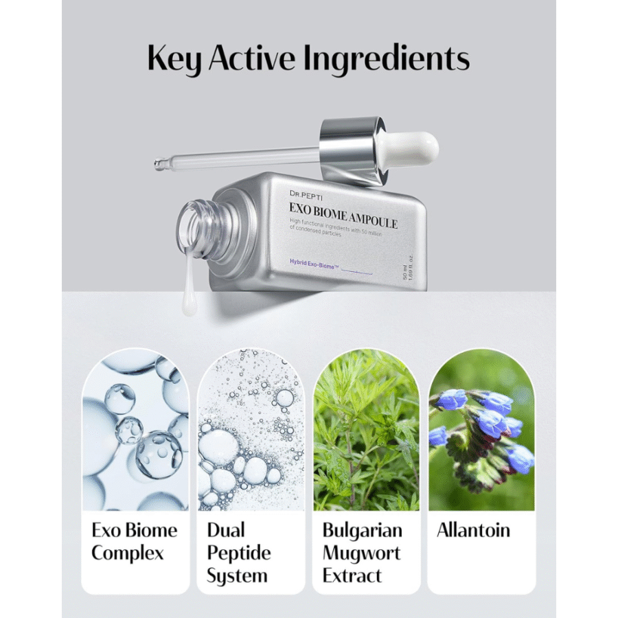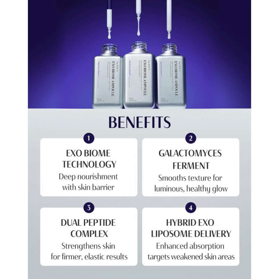 Revitalize dull and aging skin with the DR.PEPTI Exo Biome Ampoule, a breakthrough Korean serum powered by microbiome science and advanced fermentation. Formulated with 500 ppm Lactobacillus extracellular vesicles and 69.4% Galactomyces ferment filtrate, this ampoule helps restore skin balance, strengthen the barrier, and promote a luminous complexion. The unique Elastic Thread Formula delivers a tightening sensation while deeply nourishing the skin, enhancing firmness and facial contours. Enriched with dual peptides, niacinamide, and soothing botanicals, it works to improve skin elasticity, refine texture, and provide lasting hydration. Perfect for those seeking both anti-aging performance and radiant glow, this ampoule layers easily to deliver customized care.