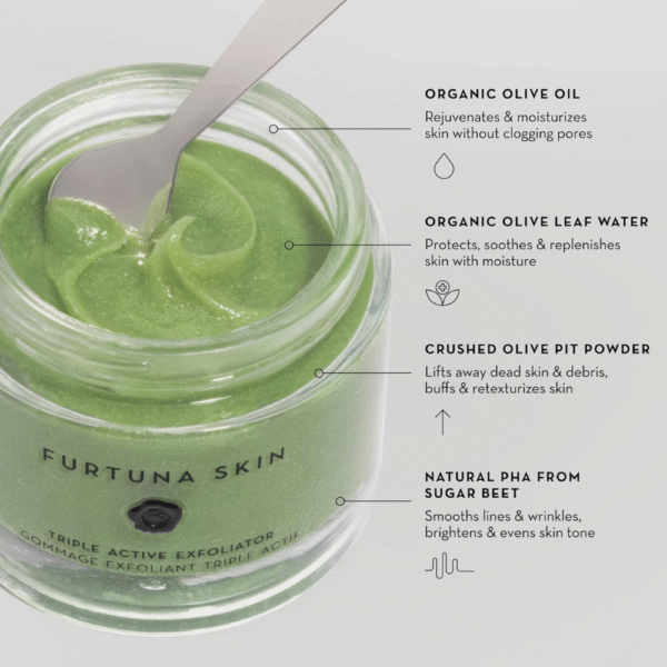 The Furtuna Skin Triple Action Exfoliator is a luxury facial scrub that combines the power of plant enzymes, olive pit powder, PHAs, and AHAs for a complete skin-renewing treatment. This multi-functional exfoliator gently clears away dull, dead skin cells while detoxifying and brightening your complexion. nfused with olive leaf water for purifying benefits and nourishing olive oil to strengthen the skin barrier, it leaves skin feeling smooth, hydrated, and refreshed never stripped. Perfect for all skin types, this vegan and cruelty-free exfoliant supports both healthy skin and a healthy planet.
