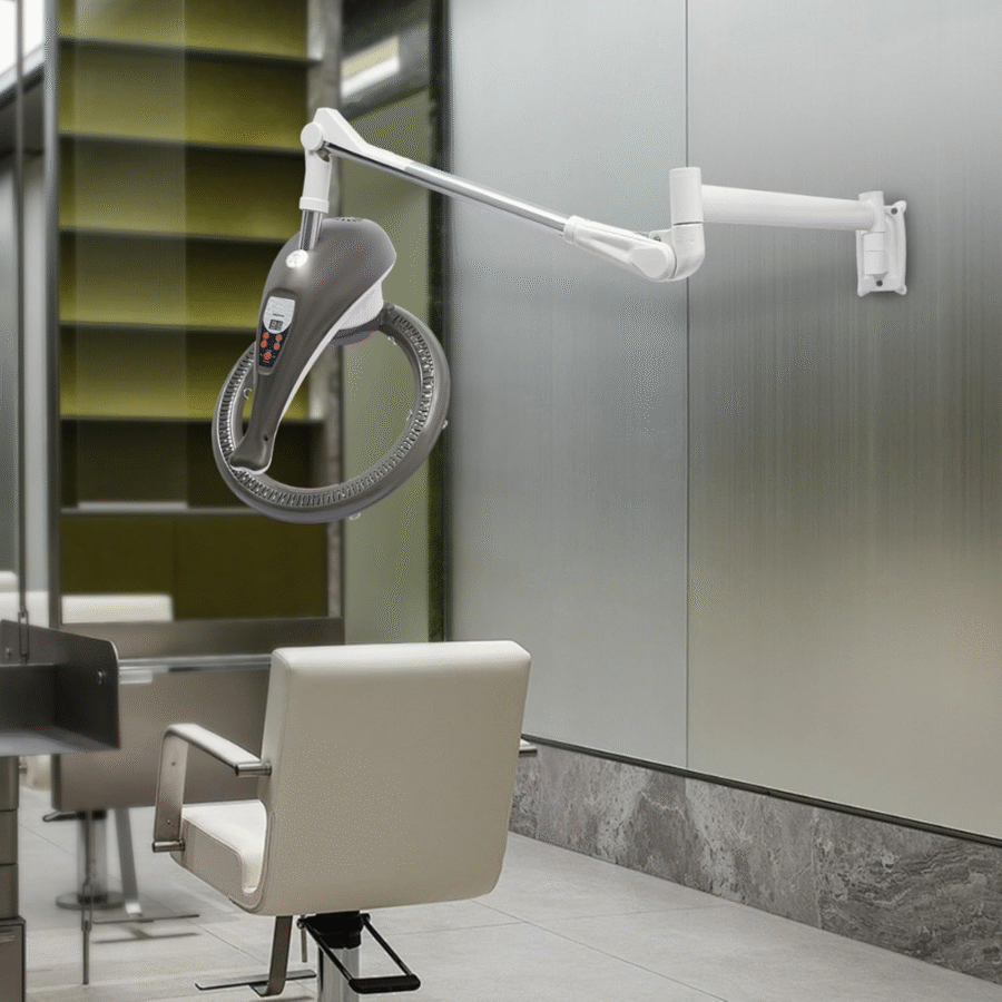 This 950W Wall-Mount Orbiting Hair Processor is designed for professional salons, spas, and home use, delivering efficient and even heat for optimal hair treatments. Equipped with stainless steel heating tubes and a 360° rotating heating ring, it provides all-around heating at adjustable temperatures from 104–140℉ without damaging hair. The time can be set from 0–60 minutes, allowing for customized care for different hair types. Its premium ABS and stainless steel construction ensures durability, corrosion resistance, and long service life. With a flexible adjustable arm, intuitive control panel, and easy-to-clean open design, this machine combines functionality and convenience in one sleek unit.