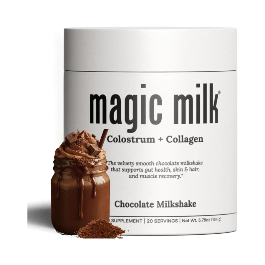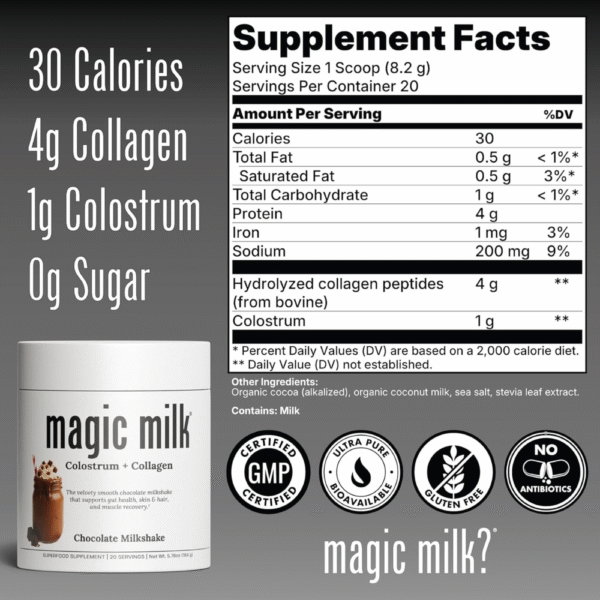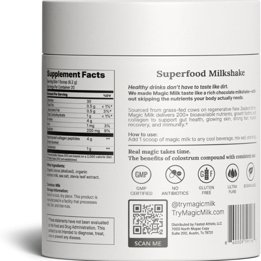 Magic Milk transforms the nostalgic taste of chocolate milk into a nutrient-packed superfood. Blending grass-fed New Zealand colostrum, collagen peptides, and organic cacao, this creamy, sugar-free drink supports gut health, skin, hair, and post-workout recovery all while satisfying your sweet tooth naturally. With immunoglobulins (IgG), lactoferrin, digestive enzymes, and growth factors, colostrum helps strengthen immunity, soothe digestion, and aid recovery. Collagen peptides further support skin elasticity, joint comfort, and hair health, making this blend a powerhouse for inside-and-out wellness. At only 30 calories per serving with 0g sugar, Magic Milk is a clean, satisfying alternative to sugary chocolate milk. Mix with milk, nut milk, or water for a smooth, chocolatey drink that nourishes and revitalizes.