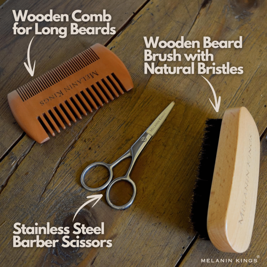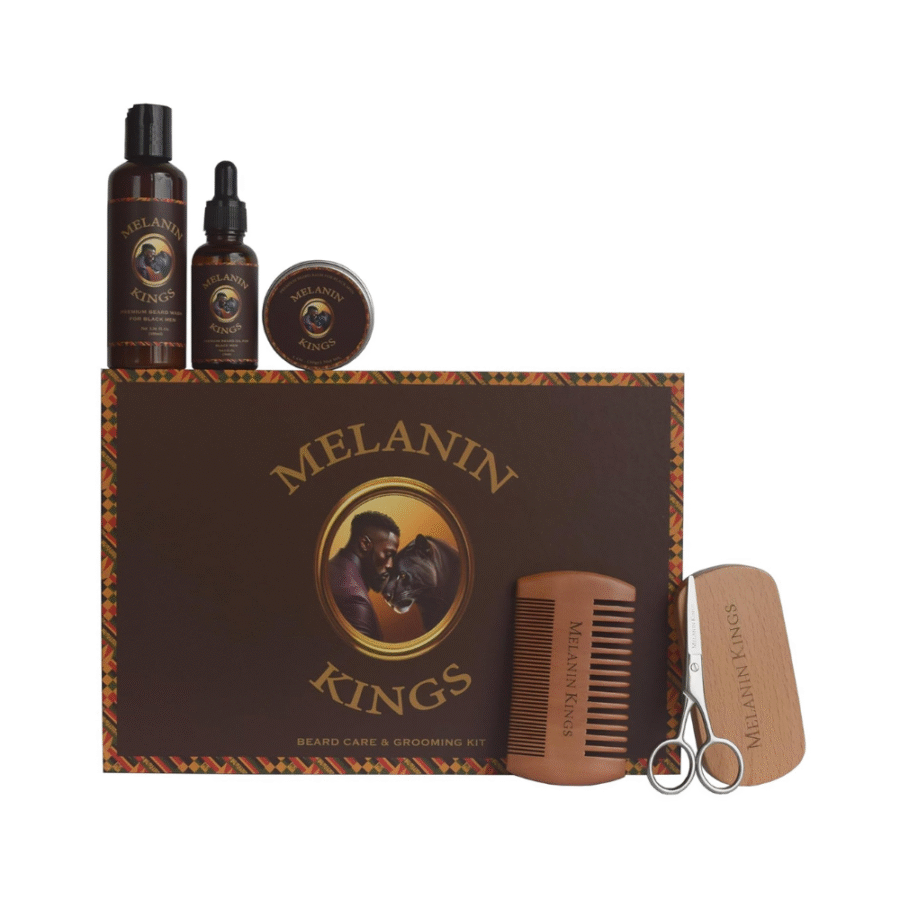 The Melanin Kings Beard Grooming Kit is specifically formulated to meet the unique needs of Black and mixed men’s beards, which often require extra hydration, frizz control, and shaping ease. Infused with 9 premium natural oils including Baobab oil and Shea butter, this nutrient-rich set delivers essential vitamins (A, B, C, D, E, K), omegas (2, 3, 6, 9), and minerals to soften, repair, and protect facial hair while nourishing the skin beneath. The included beard wash, oil, and balm work together to prevent itching, beard dandruff, and dryness while promoting healthy beard growth. With a wooden comb, premium brush, and stainless steel trimming scissors, this kit offers everything you need to maintain a polished, well-groomed look.