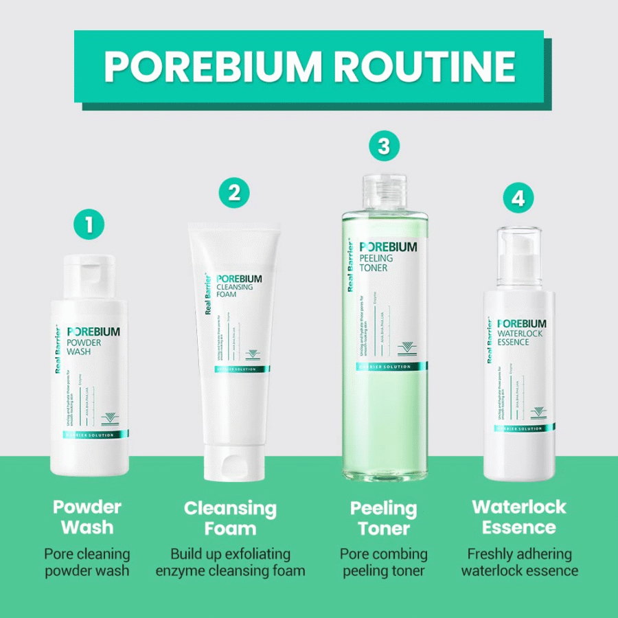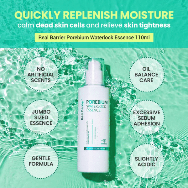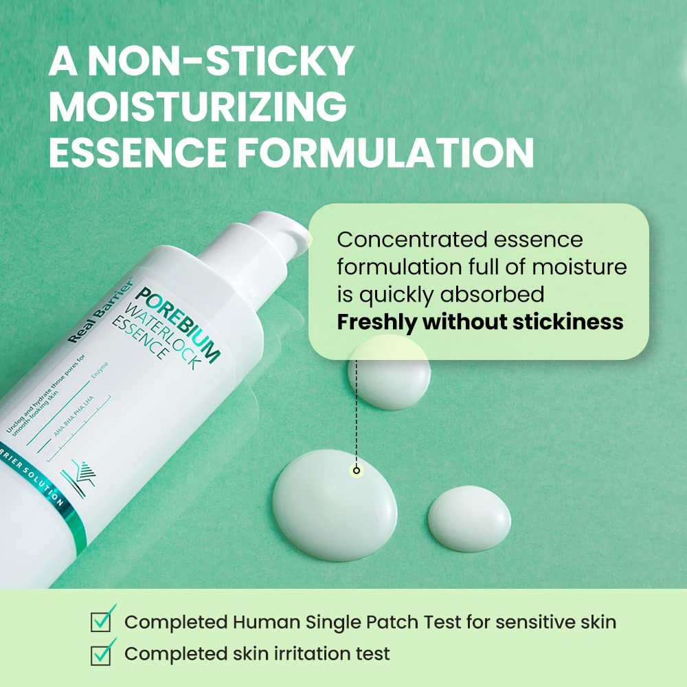 Experience the perfect balance of pore care and hydration with the Real Barrier Porebium Waterlock Essence. This 2-in-1 formula gently exfoliates dead skin cells and excess sebum while instantly cooling and hydrating sensitive skin. Featuring 4Acidzyme technology, it blends natural enzyme peeling with four types of mild acids to unclog pores, smooth texture, and enhance absorption without irritation. With its watery, cooling texture, this essence absorbs quickly, providing refreshing hydration layer by layer. Infused with mulberry extract, it leaves skin calm, soothed, and revitalized. The low pH, fragrance-free formula is dermatologist-tested and safe for sensitive skin, helping support barrier health while refining pores for a clearer, smoother complexion.