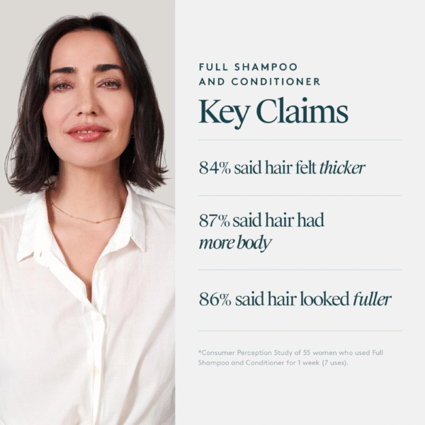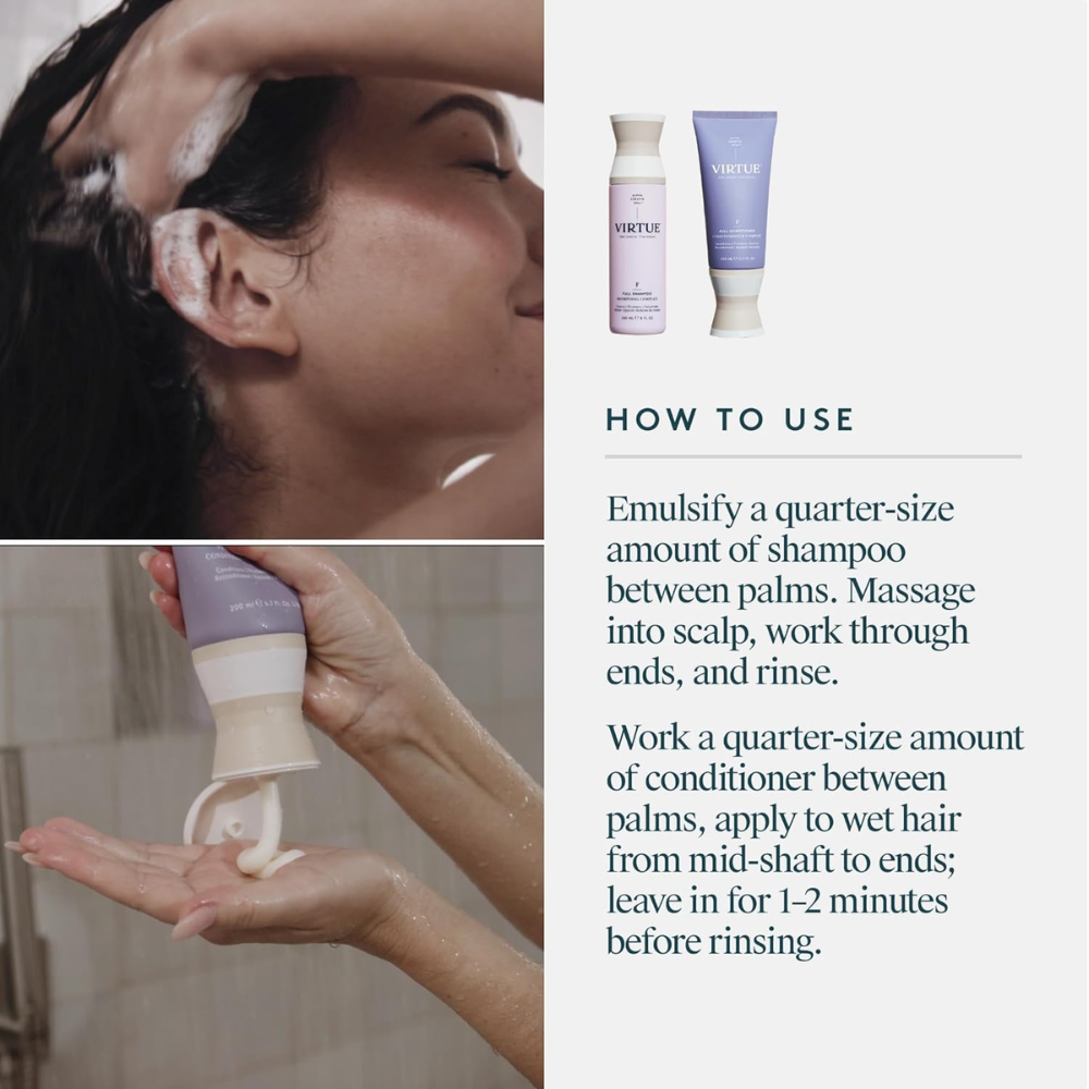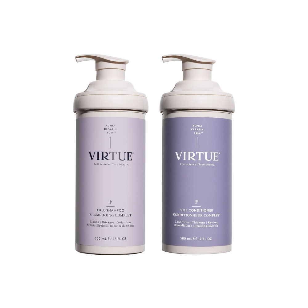 Boost volume and fullness with the Virtue Full Volumizing Shampoo and Conditioner Set. This sulfate-free duo is formulated with Alpha Keratin 60ku®, a unique protein that binds directly to hair to repair damage while adding lightweight body and thickness. The Volumizing Shampoo gently cleanses without stripping, leaving hair light, airy, and ready for lift. The Volumizing Conditioner hydrates and detangles while strengthening strands, giving hair natural movement and fullness without weighing it down. Safe for color-treated and chemically treated hair, this set is ideal for fine, limp, or thinning hair in need of bounce and vitality.